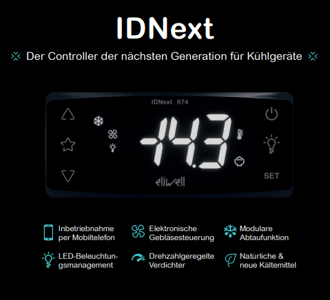 The outstanding technical control reliability of the refrigeration points is implemented in the new IDPlus with a larger display, coloured symbols and the rounded front panel; available with display in blue, amber and red as well as white, blue and dark grey front panel.