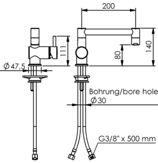 - Quick-fixing and 2 x 3/8" flexible hoses (460 mm),